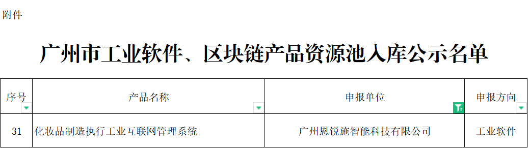 根据《广州市工业和信息化局关于组织开展工业软件、区块链产品资源池》要求,恩锐施经申报、专家评审等程序,恩锐施制造执行工业互联网管理系统成功入选广州市工业软件、区块链产品资源池